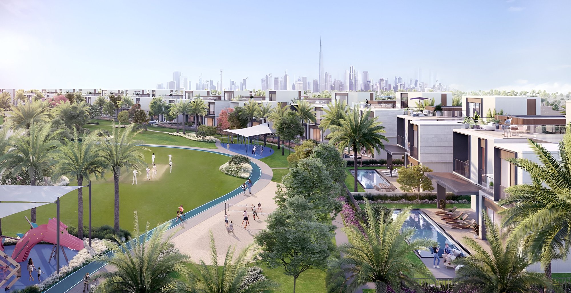 - Dubai Hills Park with jogging tracks, sports facilities, and a splash park